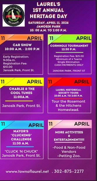 The day will consist of a Car Show @ 10:00 AM, Charlie and The Cool Tones performing at 11:00, food and non food vendors, Mayor Challenge, Cornhole Tournament, Petting Zoo (Sponsored by the Laurel Historical Society), Family Friendly Activities. The Historical Society will have Hitchens Homestead and Rosemont opened for tours.